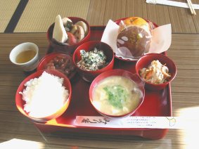 ご飯、なめこのみそ汁、白あえ、煮しめ、煮豆、大根なます、菓子が並びます。お膳もリニューアル。