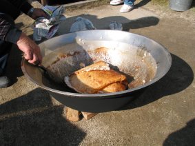 平釜でご飯を炊きますと、美味しいお焦げが副産物?としてできあがります。熱々は大変においしゅうございます。