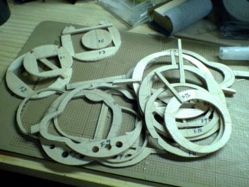 縦通材とプランク材で胴枠の位置は決まってきましたので、基準となっていたメカプレートの余分なところをリューターで落としていきます。他にも位置決めに使っ