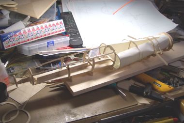 胴体下面は縦通材を足してやりました。そろそろバンジーフックの周辺と胴体後部下面の垂直安定板(カーボンロッドを追加して尾そりとします)のアンカー部分の