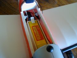 バッテリーは図面に従って主翼の上にホルダーを2ミリバルサで箱を作ってやります。他の作業が終わってからバッテリーを仮に載せ重心位置を合わせて現物あわせで良いと思います。バッテリーはマジックテープで固定されます。