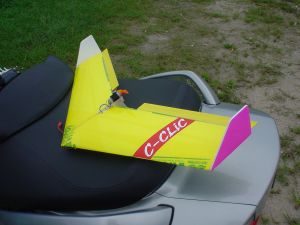 フィンはもっと三角にして前側の面積を減らしてやったり、翼端から後部へ延長してやるほうが安定は良いかもしれませんが、あまり大きくするとスクーターのトランクに入れにくくなります。