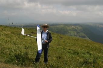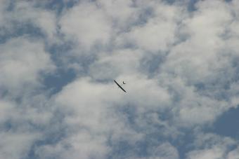 風が良くなってからスロープで調整フライトにのぞみましたが、風速3−4mで浮きは全く問題ありません。モーター付きであれだけ苦労していたのが嘘のように良く浮きます。ダイブさせても変な癖は無く重心位置も問題無い様でした。